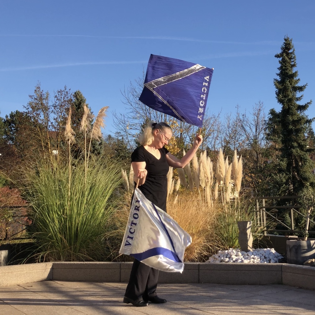 Eine kleine dunkelblaue Flagge mit beidseits einer Schwert-Applikation aus weißen Pailletten auf einem drehbaren Stab mit Kugel. Für diese Flagge habe ich einen Taft-Stoff verwendet, dieser ist einerseits robust und beim Schlagen der Flagge ist er viel lauter als zum Beispiel ein normaler Lamé-Stoff.