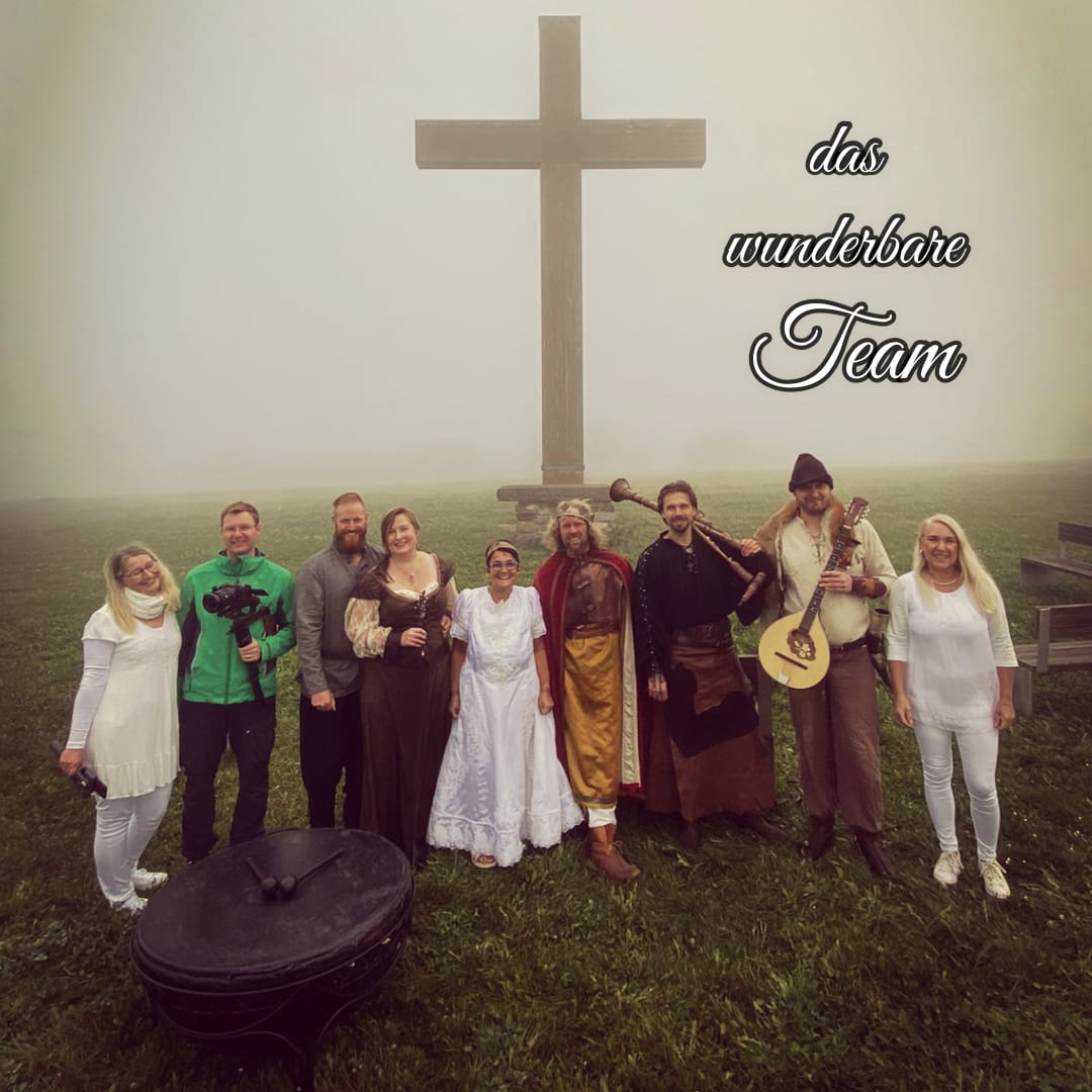 Wir hatten auch nur bis 12.30 Uhr Zeit hier zu drehen. Also was tun. Den ganzen Dreh-Plan über den Haufen werfen oder trotzdem drehen. Anna hat sich fürs Drehen bei Nebel entschieden und so entstanden dann echt epische Aufnahmen. Geplant hätte man es so nicht hinbekommen. Wir drehten die Flaggen-Szenen mit dem König, den Marsch der ganzen Gesellschaft zum Kreuz, den Tanz vor dem Kreuz und Musikeraufnahmen vor dem Kreuz. Es war teilweise schon sehr kalt, so dass man, wenn man nicht gerade gefilmt wurde, schauen mußte, wie man wieder warm wird.