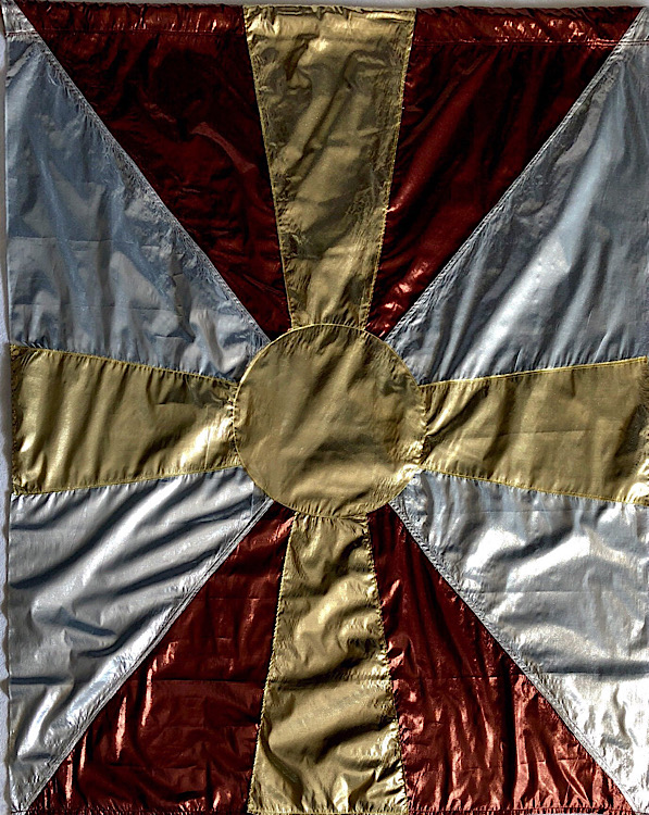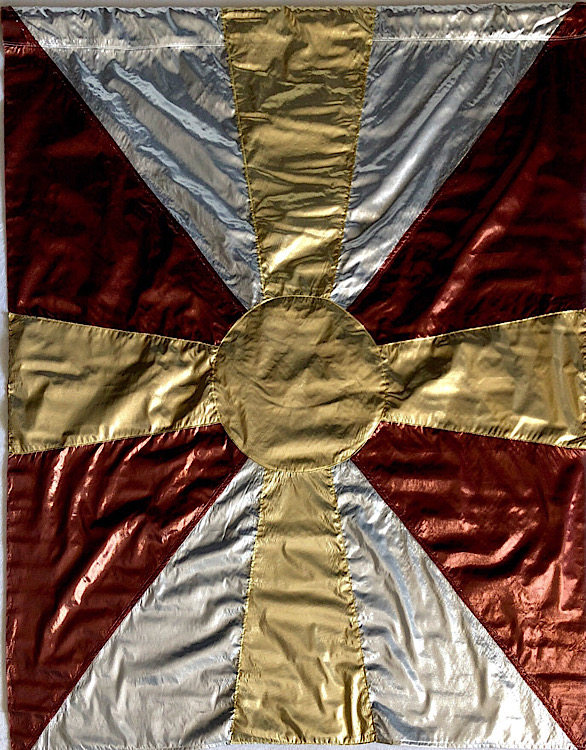 Die Flagge wurde aus Lamé gefertigt. Zuerst habe ich die Grundflagge aus dem blauen und braunen Lamé genäht. Die Krone wurde auf beiden Seiten appliziert. Ich habe mich in diesem Fall für die Applikation entschieden. Dadurch ist die Flagge insgesamt stabiler und wahrscheinlich auch haltbarer. Natürlich auch schwerer. Auf die Krone habe ich Strasssteine geklebt. Der obere Teil des goldenen Rahmens wurde als erweiterter Tunnel an die Flagge genäht. Der seitliche Teil des goldenen Rahmens, wie auch die goldenen Strahlen wurden eingesetzt, d.h. hier ist der Stoff einlagig. Ebenso wurde die Taube eingesetzt.