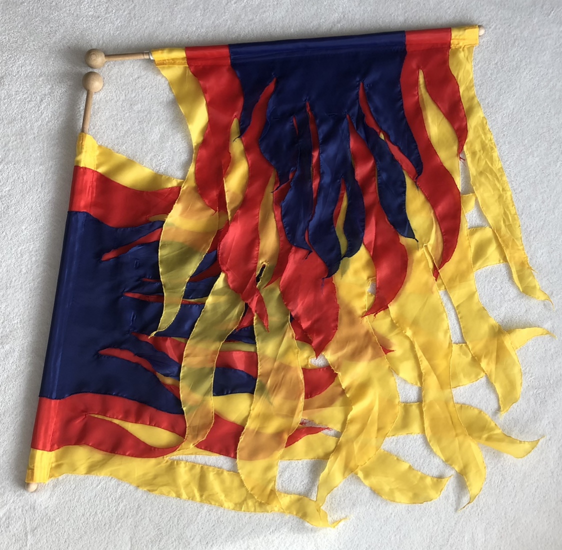 Kleine Motiv-Flaggen haben ebenfalls ihre Berechtigung. Der Vorteil von kleinen Flaggen ist, das man sie auch noch bei wenig Platz einsetzen kann. Meine kleinen Motiv-Flaggen sind normalerweise 65cm x 80cm groß, ausgenommen sind da meine Feuer-Flaggen, welche eine freie Form haben. Alle meine kleinen Motiv-Flaggen sind drehbar gelagert und haben einen Knauf. Somit kann ich sehr gut die Muster spielen ohne das sich die Flaggen während des Spielens aufwickeln.