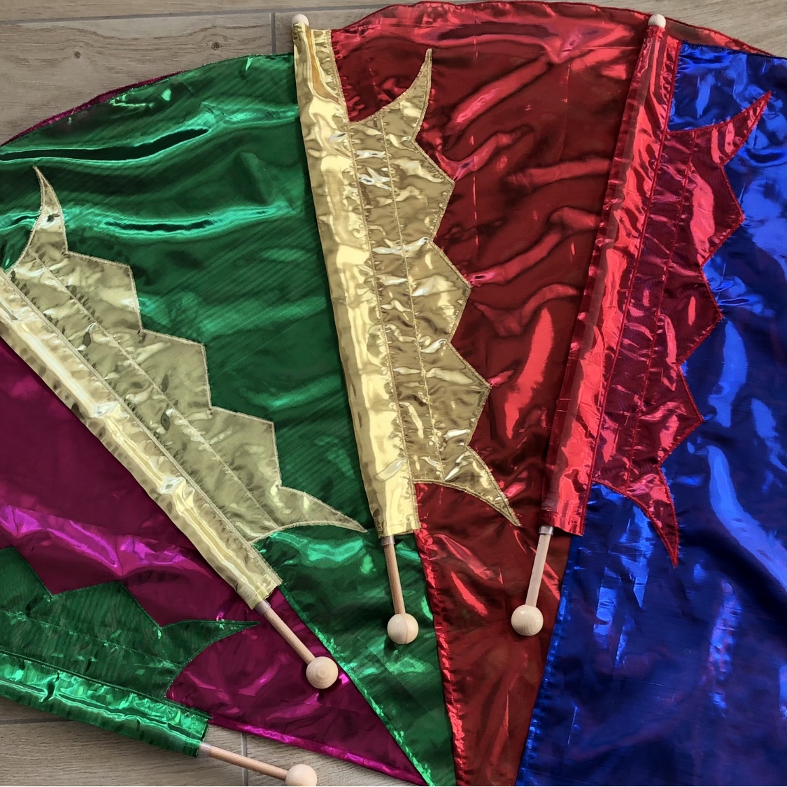 Die Kronen auf meiner JESUS-Flagge, „Wie im Himmel, so auf Erden“-Flagge, der „Liebe Gottes“-Flagge und einiger halbrunden Flaggen sind immer die Selben, in angepaßter Größe natürlich. Diese Kronen sind sehr einfach zu nähen und durch ihre Einfachheit, ist sie auch von weitem gut als Krone zu erkennen. Bei den halbrunden Flaggen habe ich sie in den Tunnel integriert.