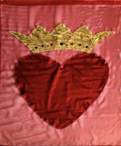 Wie bei meinen anderen großen Motiv-Flaggen auch, habe ich den Entwurf zuerst auf Papier gezeichnet. Dann habe ich die Grundflagge aus roten Organza genäht. Danach habe ich die Applikation des Herzen aus Lamé auf die Vorder- und Rückseite genäht und den überstehenden Stoff abgeschnitten. Und anschließend habe ich die Krone, ebenfalls aus Lamé, nach dem gleichen Prinzip appliziert. Außerdem habe ich auf die Krone noch die Straßsteine geklebt.