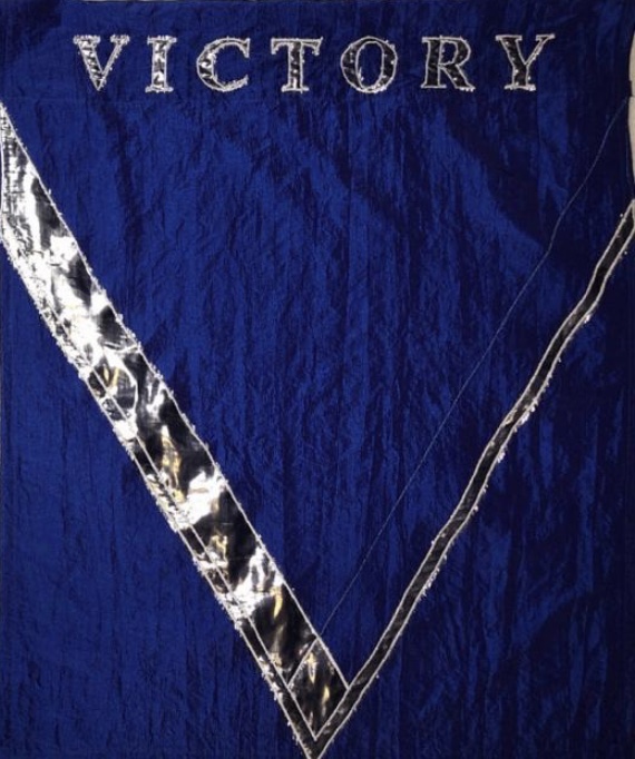 Wie bei meinen anderen großen Motiv-Flaggen auch, habe ich den Entwurf zuerst auf Papier gezeichnet. Dann habe ich die Grundflagge aus roten Organza genäht. Danach habe ich die Applikation des Herzen aus Lamé auf die Vorder- und Rückseite genäht und den überstehenden Stoff abgeschnitten. Und anschließend habe ich die Krone, ebenfalls aus Lamé, nach dem gleichen Prinzip appliziert. Außerdem habe ich auf die Krone noch die Straßsteine geklebt.