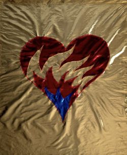 Nach dieser Gottesbegegnung habe ich mit dem Flaggenspielen in der Gemeinde sofort pausiert. Stattdessen habe ich in einem Gemeindesaal einer evangelischen Gemeinde in meinem Wohnort angefangen mich immer dienstagabends mit Gott zu treffen und vor ihn zu kommen und ihn anzubeten. Nur Gott und ich. Während dieser Zeit lernte ich die Pastoren-Ehefrau dieser Gemeinde kennen. Sie war eine Künstlerin und kam aus der Schweiz. Ich habe ihr von den beiden Flaggen erzählt und da ich künstlerisch nicht so begabt bin, habe ich sie gefragt, ob sie mir beim entwerfen helfen könnte. Sie hat das Feuer in dem Herzen entworfen. Mittels Rastervergrößerung konnte ich es dann groß malen.